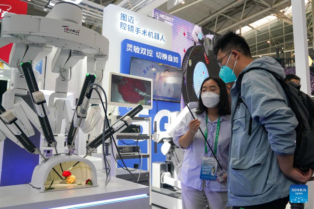 A visitor learns about endoscopic surgical robot at the seventh China-Eurasia Expo in Urumqi, northwest China's Xinjiang Uygur Autonomous Region, Sept. 20, 2022.