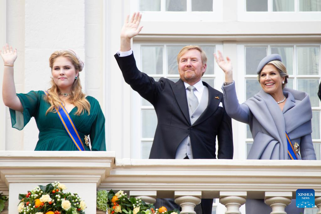Dutch Princess Amalia, King Willem-Alexander, Queen Maxima (from L to R) wave to people on the Balcony of Noordeinde Palace in the Hague, the Netherlands, on the Prince's Day, Sept. 20, 2022. The third Tuesday in September is Prince's Day in the Netherlands. It marks the opening of the Dutch parliamentary season, and on this day the reigning monarch outlines the government's plans for the year ahead. (Photo by Sylvia Lederer/Xinhua)