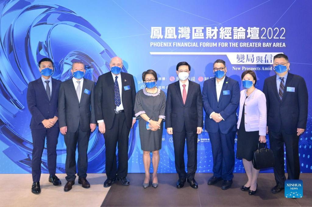 Chief Executive of the Hong Kong Special Administrative Region (HKSAR) John Lee (4th R) poses for a group photo with guests attending a financial forum held by Phoenix TV and other institutions in Hong Kong, south China, Sept. 21, 2022. The financial forum opened here Wednesday online and offline, with government officials, industry leaders and scholars discussing opportunities in the Guangdong-Hong Kong-Macao Greater Bay Area (GBA). (Xinhua)