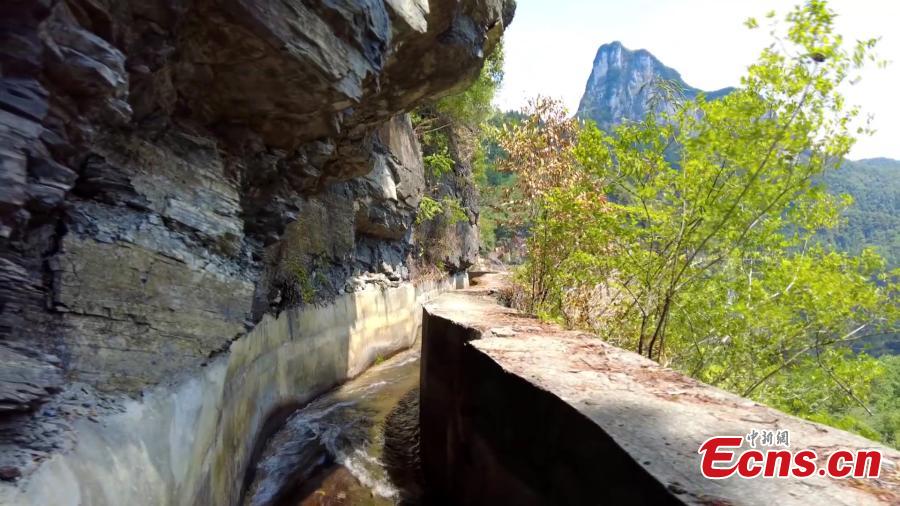 Photo shows an artificial canal built along a cliff in Huanghe town in Chongqing, Sept. 20, 2022. The 15-kilometer-long canal was constructed at an elevation of about 1,000 meters along the cliff in the 1970s. (Photo: China News Service/Li Xiaohua)