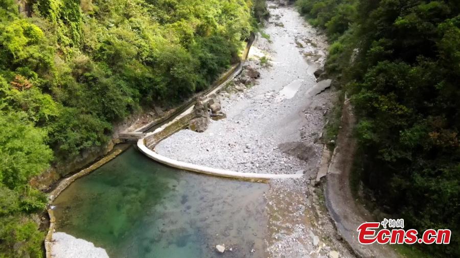 Photo shows an artificial canal built along a cliff in Huanghe town in Chongqing, Sept. 20, 2022. The 15-kilometer-long canal was constructed at an elevation of about 1,000 meters along the cliff in the 1970s. (Photo: China News Service/Li Xiaohua)