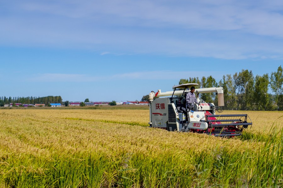 A farmer drives a piece of farming machinery to harvest rice at a family farm in Jiutai District of Changchun, northeast China's Jilin Province, Sept. 20, 2022. Autumn harvest has recently started at the rice-growing areas across the province. (Xinhua/Yan Linyun)