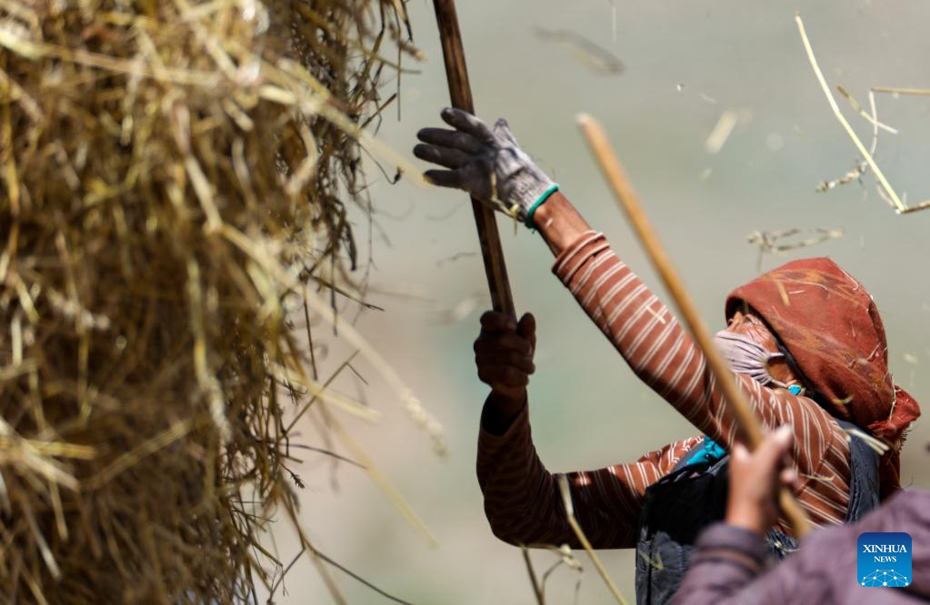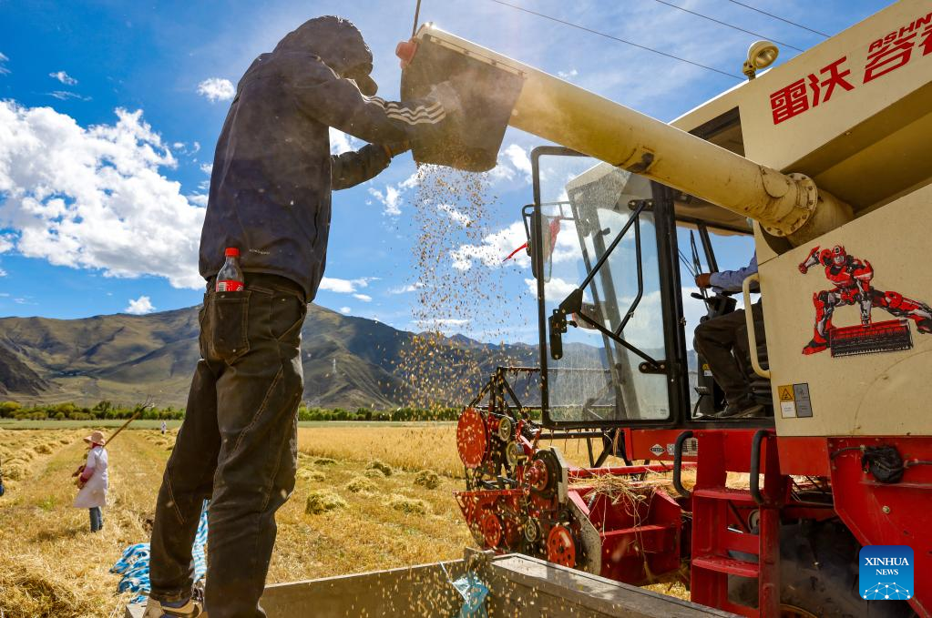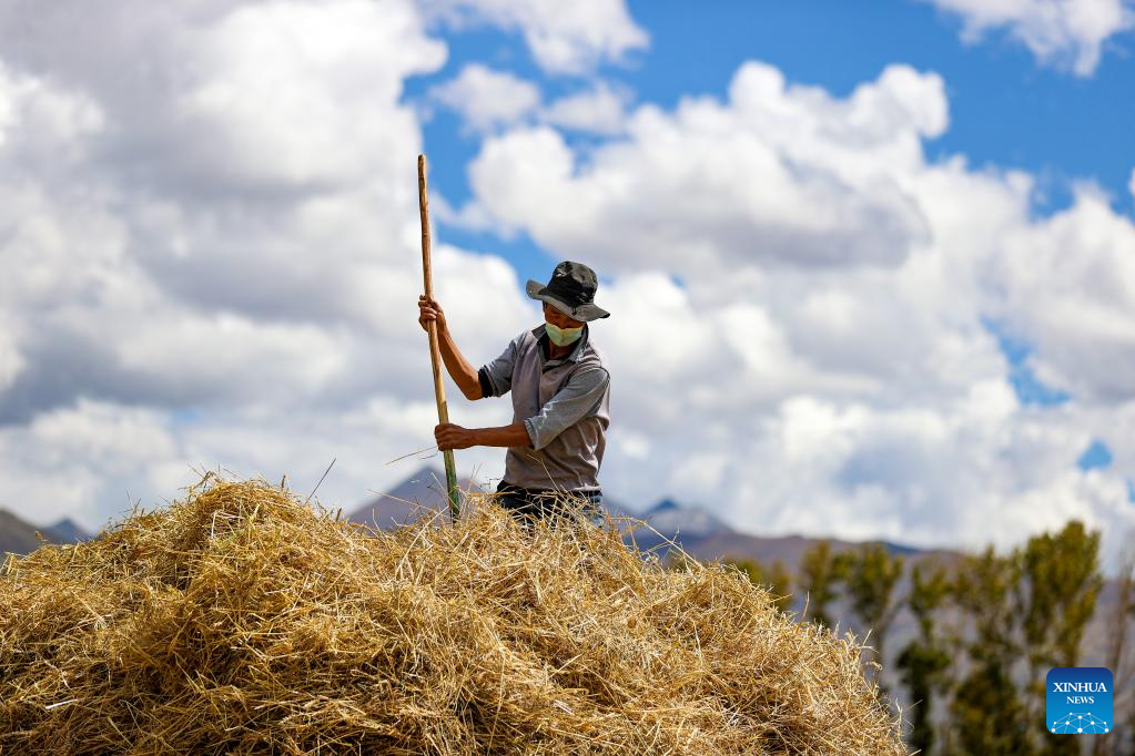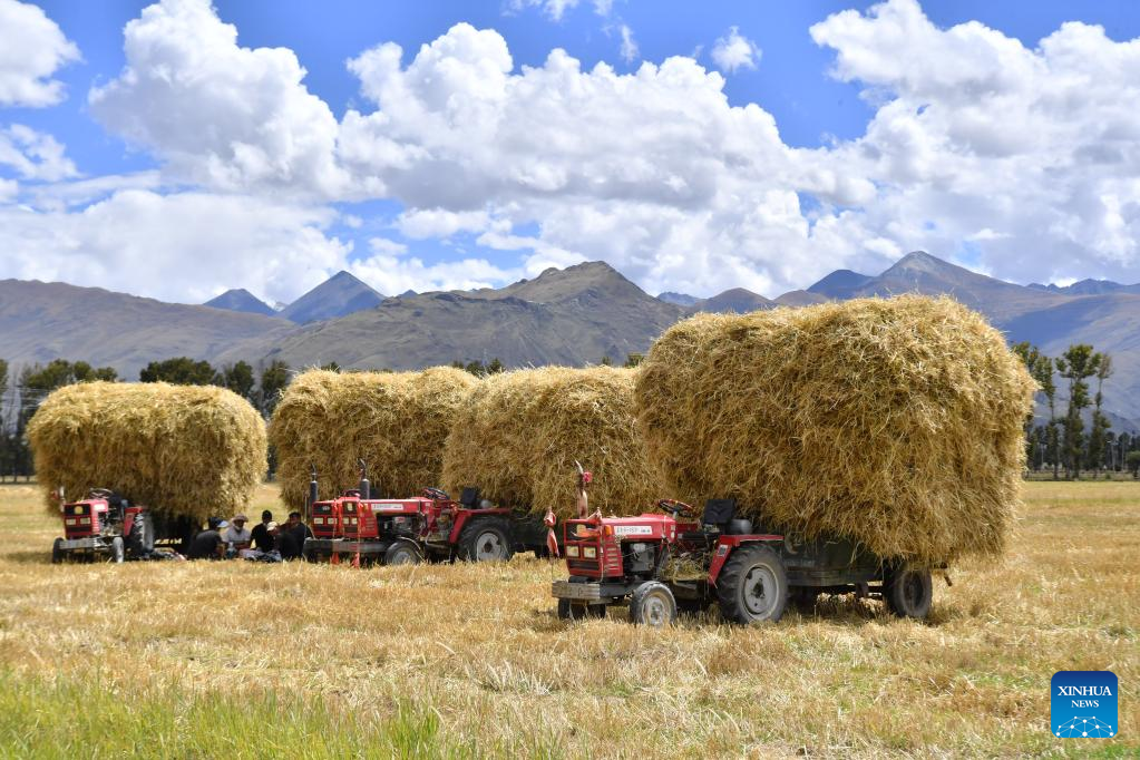 Villagers collect straws in a highland barley field in Bianlin Township, Lhunzhub County of Lhasa, southwest China's Tibet Autonomous Region, Sept. 21, 2022. (Xinhua/Chogo)