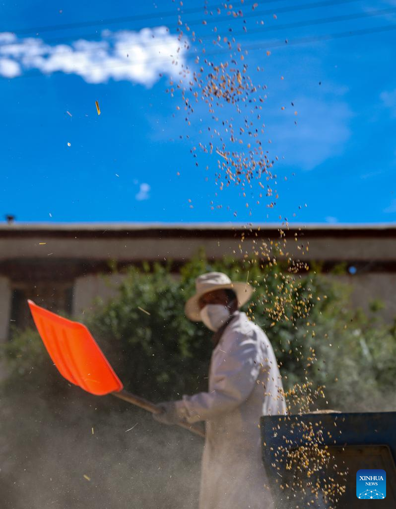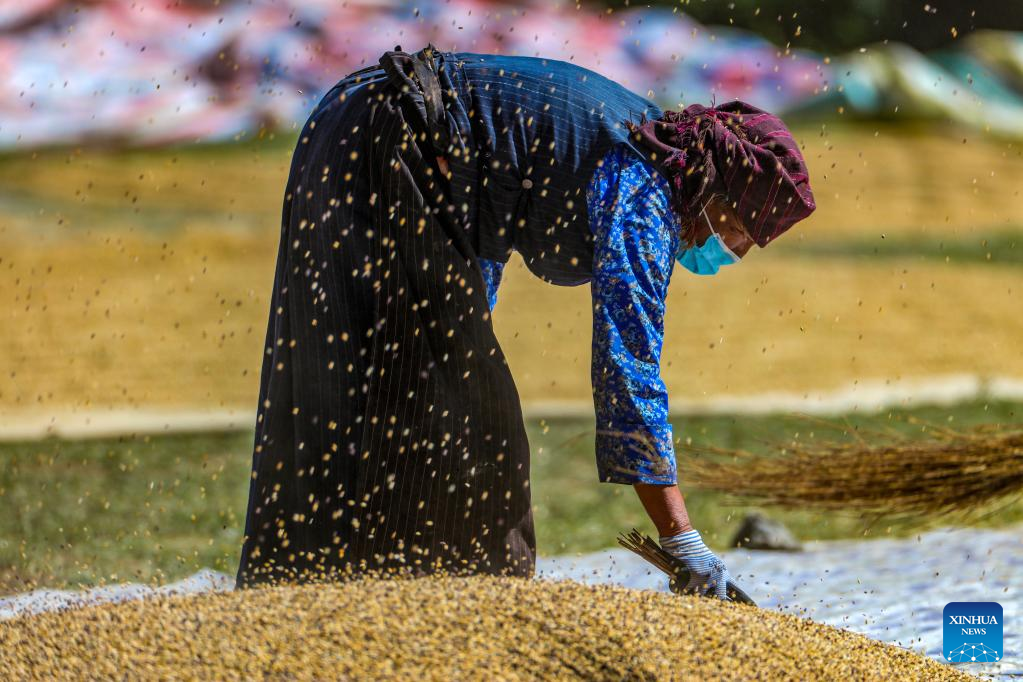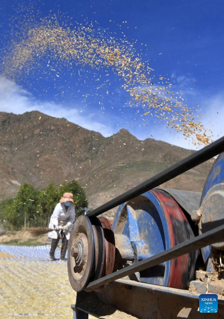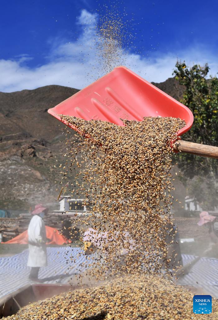Villagers winnow highland barley in Jangraxar Township, Lhunzhub County of Lhasa, southwest China's Tibet Autonomous Region, Sept. 21, 2022. (Xinhua/Chogo)