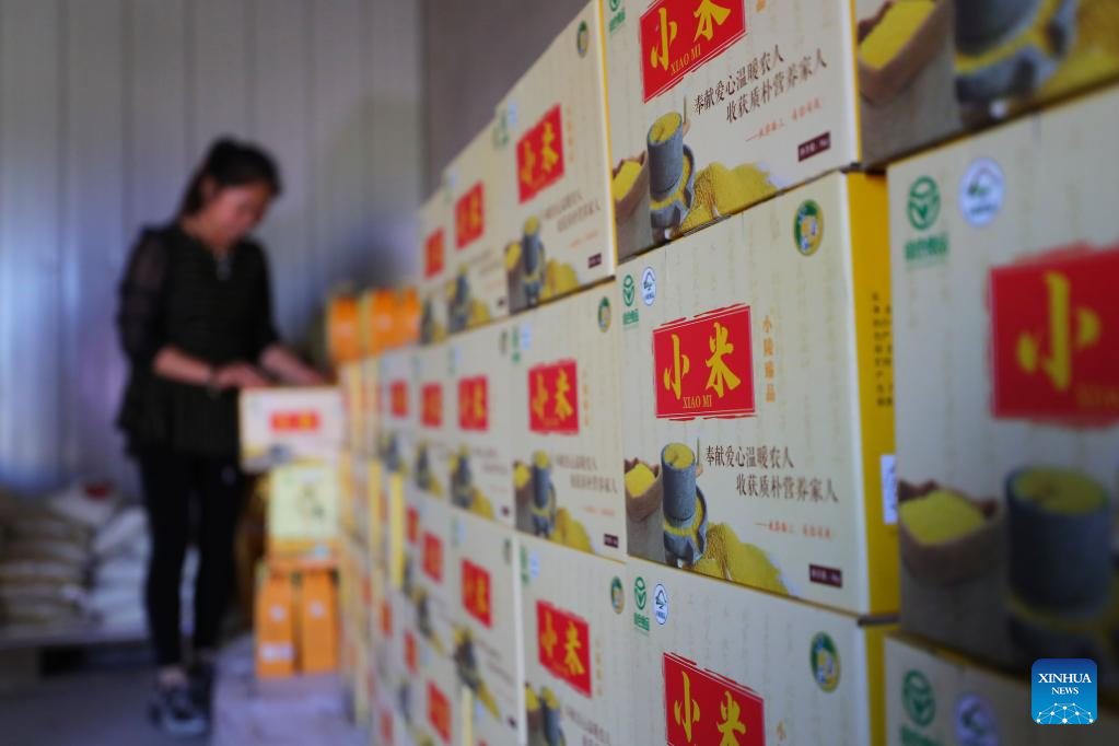 A villager packs millet into boxes in Fangjiatun Town, Kangping County, Shenyang City, northeast China's Liaoning Province, Sept. 21, 2022. Kangping County has witnessed bumper harvests of its landmark products millet, apple and sweet potato, with planting areas of 5,000 mu (about 333 hectares) , 35,000 mu (about 2,333 hectares) and 20,000 mu (about 1,333 hectares) respectively. (Xinhua/Yang Qing)