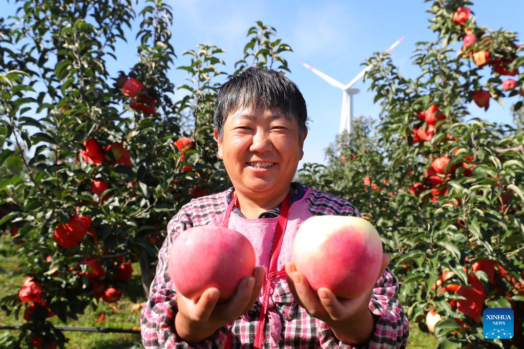 A farmer displays apples in Fangjiatun Town, Kangping County, Shenyang City, northeast China's Liaoning Province, Sept. 21, 2022. Kangping County has witnessed bumper harvests of its landmark products millet, apple and sweet potato, with planting areas of 5,000 mu (about 333 hectares) , 35,000 mu (about 2,333 hectares) and 20,000 mu (about 1,333 hectares) respectively. (Xinhua/Yang Qing)