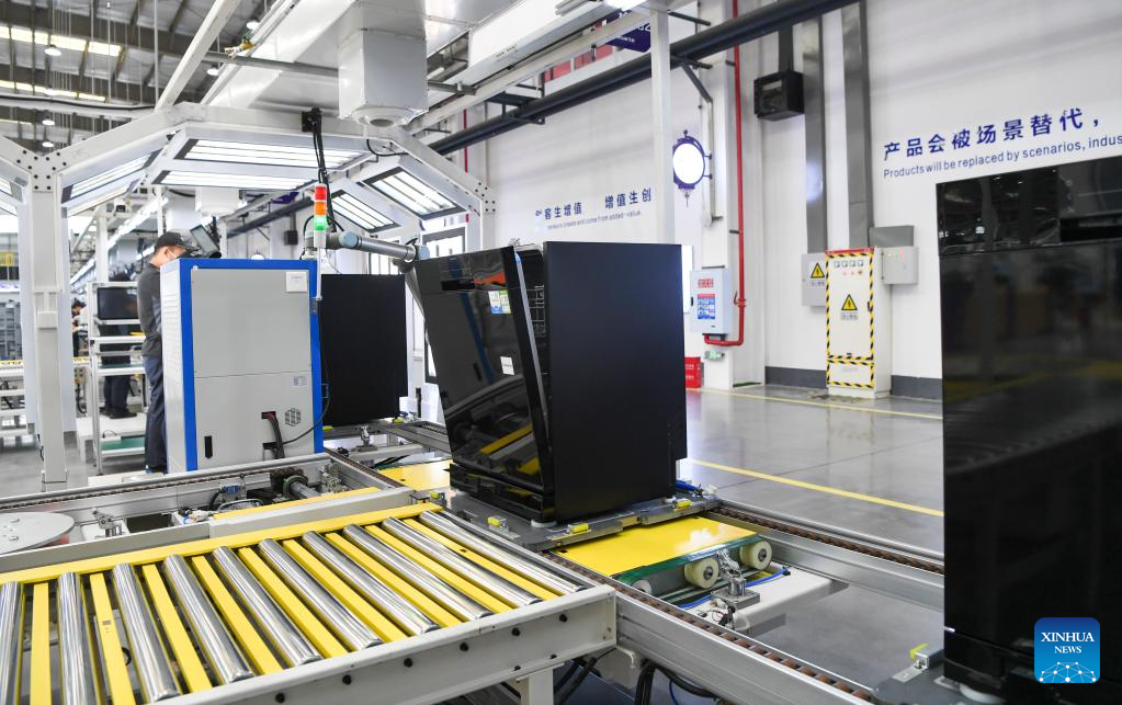 Photo taken on Sept. 25, 2022 shows the production line of a dishwasher interconnected factory of Chongqing Haier Washing Electric Appliances Co.LTD in southwest China's Chongqing. A dishwasher interconnected factory of Chongqing Haier Washing Electric Appliances Co.LTD was officially put into production here at Gangcheng Industry Park in Jiangbei District of Chongqing on Sunday. This 42,000-square-meter factory, with a designed annual output of one million dishwashers, will utilize advanced technologies like 5G and Industrial Internet towards the digitization and intelligentization of dishwasher production. (Xinhua/Wang Quanchao)