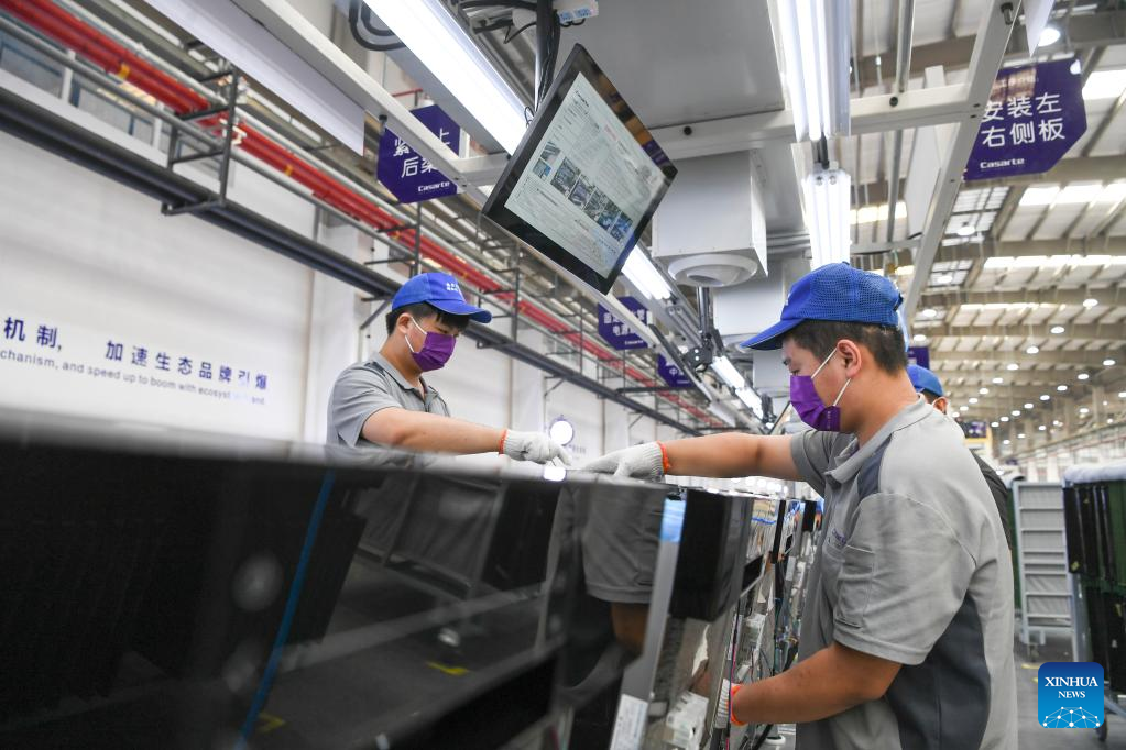 Workers are seen at the production line of a dishwasher interconnected factory of Chongqing Haier Washing Electric Appliances Co.LTD in southwest China's Chongqing, Sept. 25, 2022. A dishwasher interconnected factory of Chongqing Haier Washing Electric Appliances Co.LTD was officially put into production here at Gangcheng Industry Park in Jiangbei District of Chongqing on Sunday. This 42,000-square-meter factory, with a designed annual output of one million dishwashers, will utilize advanced technologies like 5G and Industrial Internet towards the digitization and intelligentization of dishwasher production. (Xinhua/Wang Quanchao)