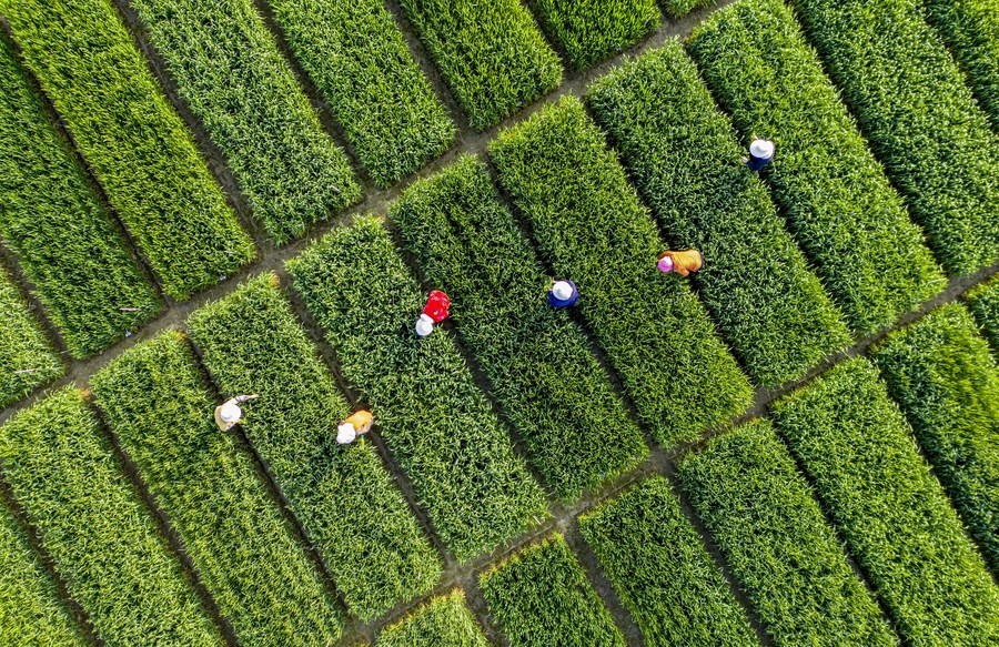 Aerial photo taken on March 30, 2022 shows people weeding in a field at Baihu Township in Lujiang County of Hefei, east China's Anhui Province. (Photo by Zuo Xuechang/Xinhua)