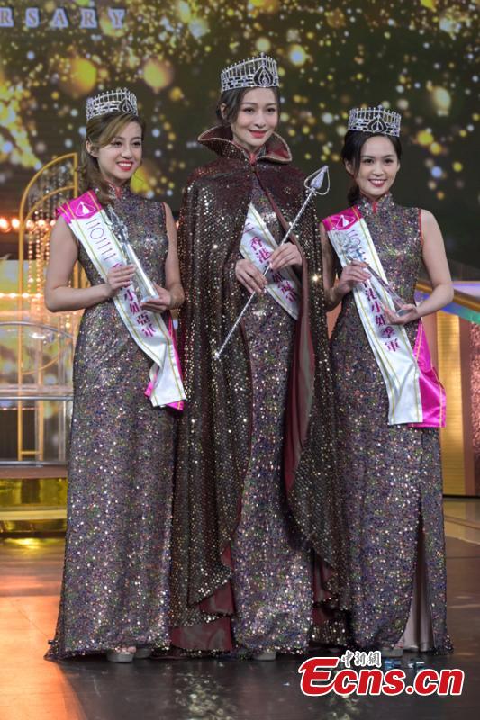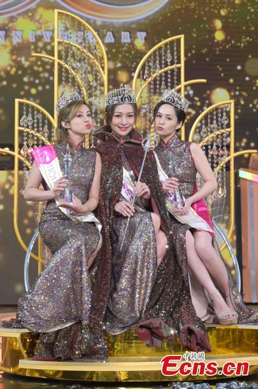 Miss Hong Kong 2022 Denice Lam (C) poses for a photo with runner up Cecca Xu (L), and third winner Joey Leung, at the end of TVB Miss Hong Kong Pageant 2022 held on Sept. 25, 2022. (Photo: China News Service/Chen Yongnuo)