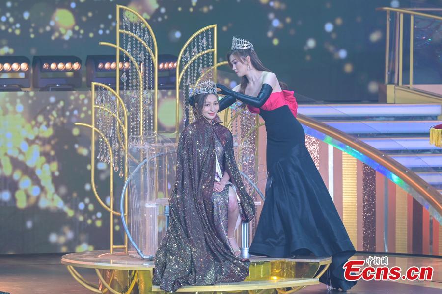 Miss Hong Kong 2021 winner Sabina Mendes de Assuncao (R) crowns Denice Lam at the TVB Miss Hong Kong Pageant 2022 on Sept. 25. (Photo: China News Service/Chen Yongnuo)