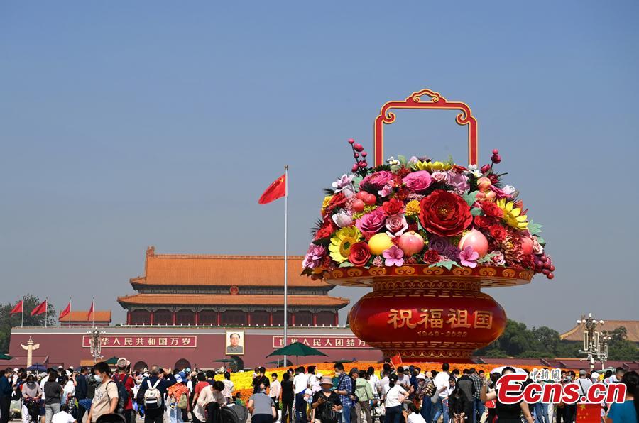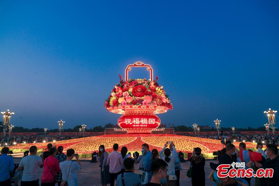 A huge flower basket arrangement with the theme "blessings to China" is lighted up at the Tiananmen Square in Beijing on Sept. 25, 2022, to celebrate the upcoming National Day holiday. (Photo: China News Service/Jia Tianyong)