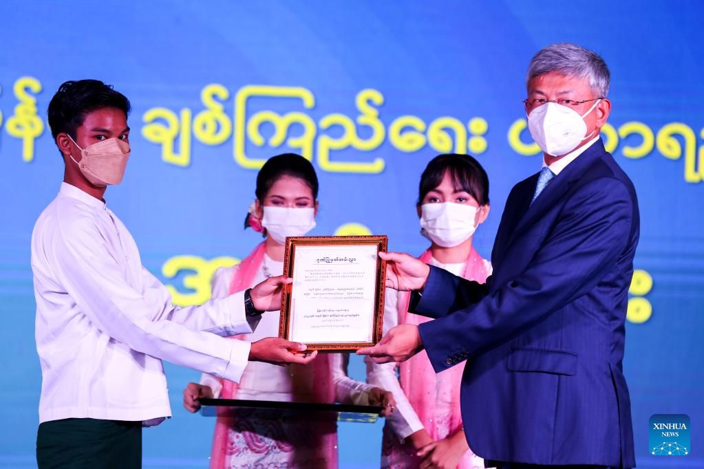 Chinese Ambassador to Myanmar Chen Hai (1st R) gives the certificate to a student during the awarding ceremony of the China-Myanmar friendship awards in Yangon, Myanmar, Sept. 26, 2022. (Photo by Myo Kyaw Soe/Xinhua)