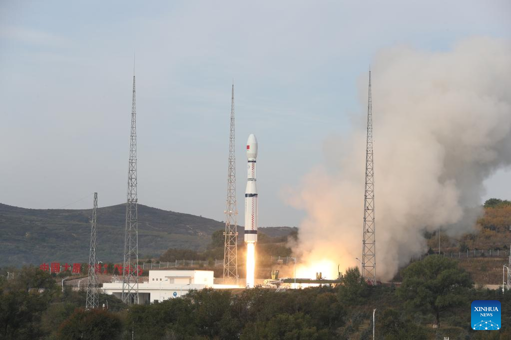 A Long March-6 rocket carrying three satellites blasts off from the Taiyuan Satellite Launch Center in north China's Shanxi Province, Sept. 27, 2022. The rocket blasted off at 7:50 a.m. (Beijing Time) from the Taiyuan Satellite Launch Center and sent the Shiyan-16A, Shiyan-16B and Shiyan-17 satellites into the preset orbit. (Photo by Zheng Bin/Xinhua)