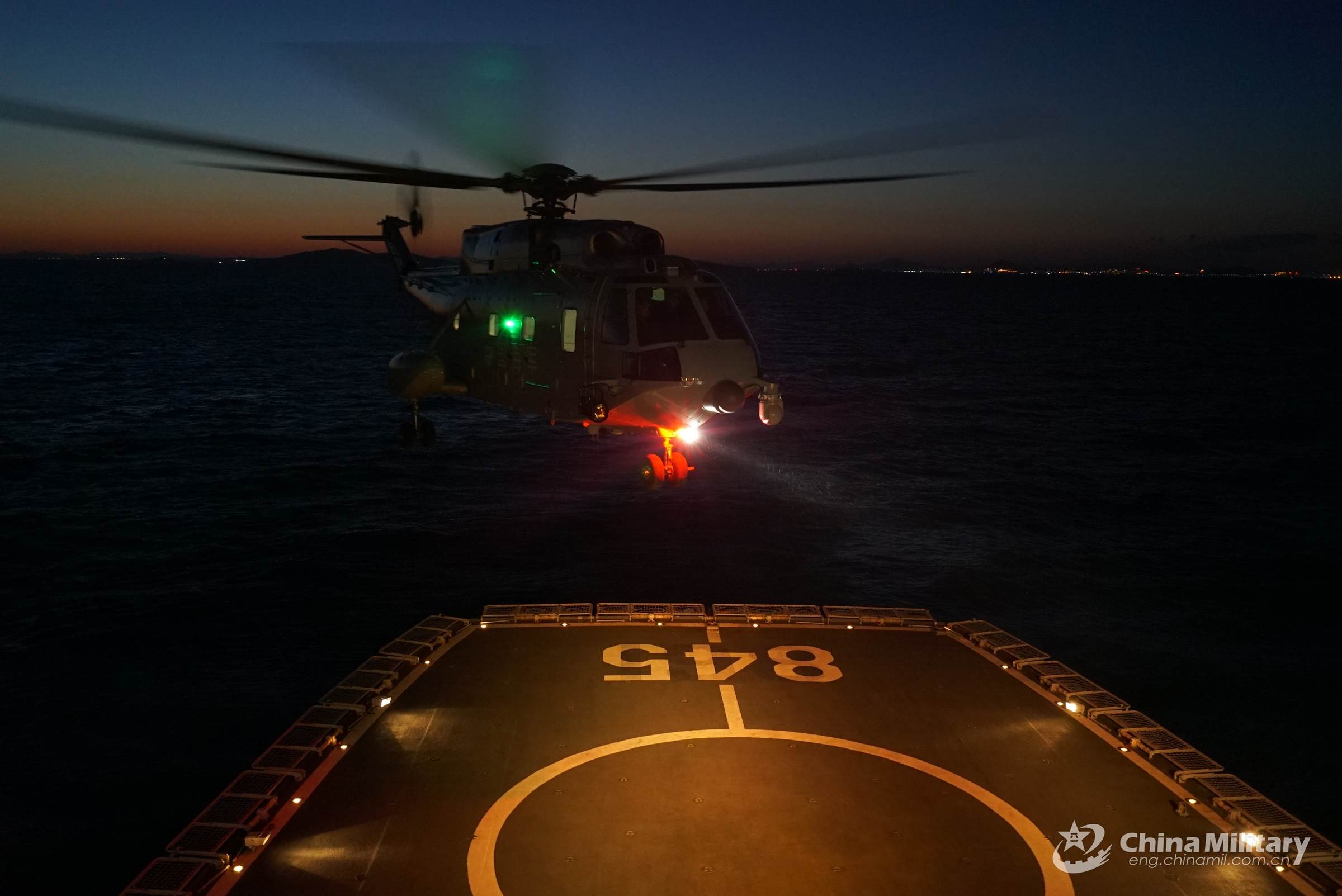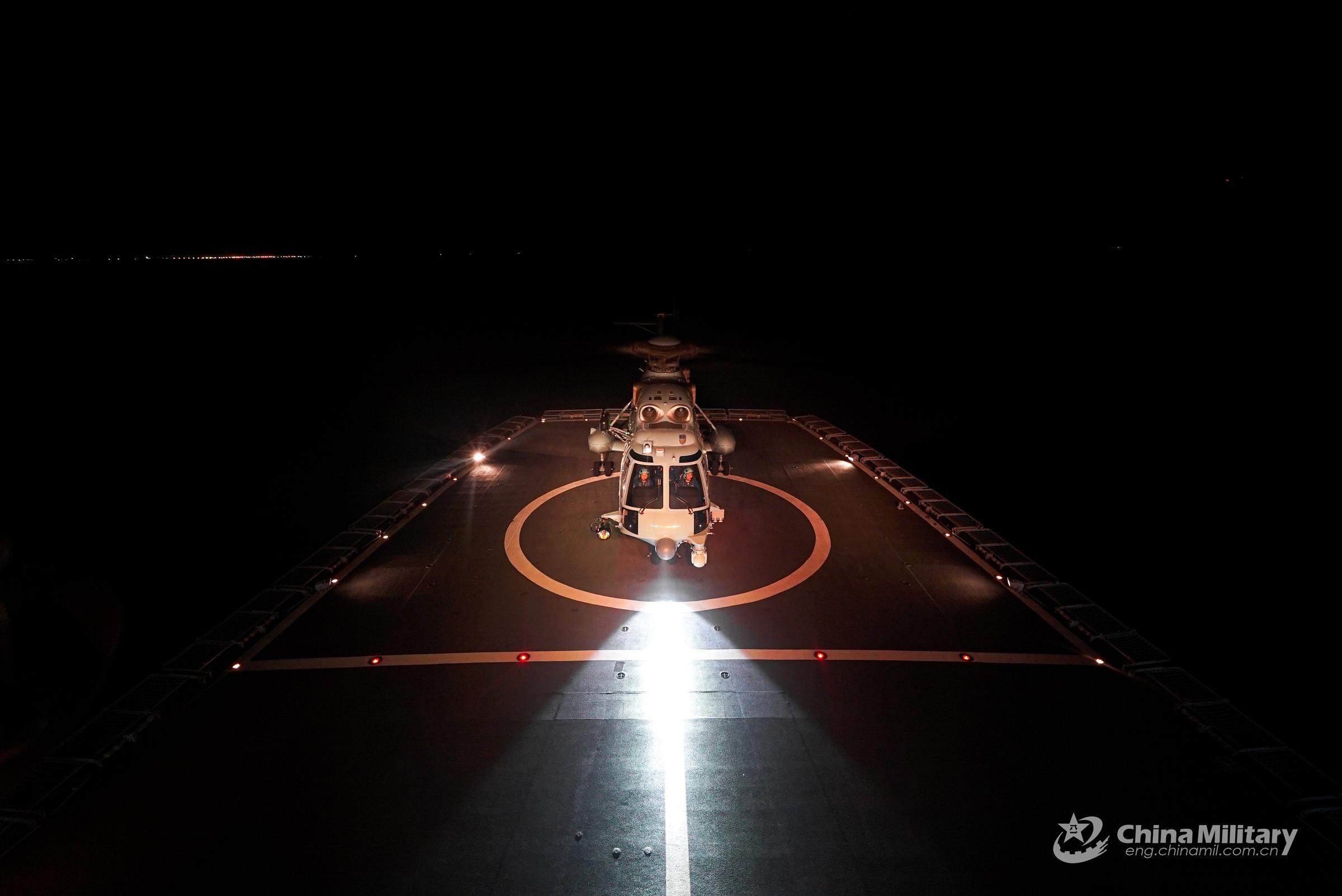 A ship-borne helicopter lands on the helipad of a warship during a round-the-clock training exercise on landing and taking off from the ship's helipad on September 7, 2022. The training was jointly carried out by the units from a naval search and rescue flotilla under the PLA Northern Theater Command and the PLA Naval Aeronautical University. (eng.chinamil.com.cn/Photo by Ma Yingming)