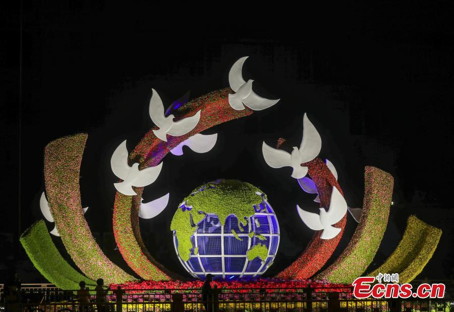 A themed flower display is set up at the corner of the Xidan intersection of the Chang'an Avenue in Beijing to celebrate the National Day, Sept. 26, 2022. (Photo: China News Service/Yi Haifei)