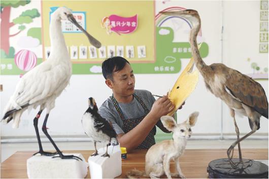 Dong Tao popularizes science knowledge to children using bird specimens at a children's palace in Chenguan township, Dongying city, east China's Shandong Province. (Photo/sd.dzwww.com)