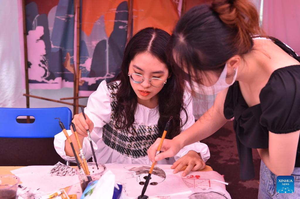 Two Vietnamese students try traditional Chinese painting at Hanoi University in Hanoi, Vietnam, Sept. 26, 2022. (Xinhua/Jiang Shengxiong)