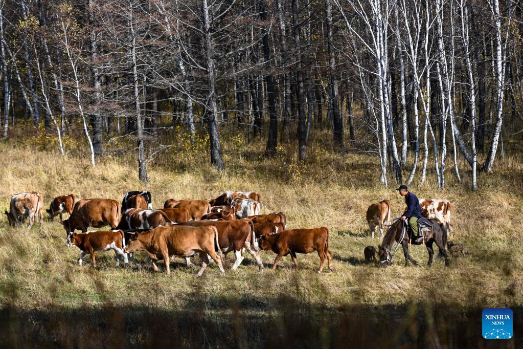 A herdsman herds cattle in Chaihe Town, Zhalantun City of north China's Inner Mongolia Autonomous Region, Sept. 27, 2022. (Xinhua/Wang Zecong)