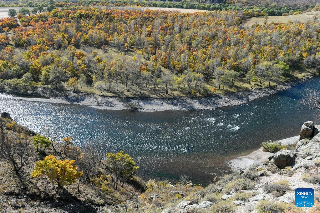 Photo taken on Sept. 27, 2022 shows autumn scenery at Shidawan scenic spot in Chaihe Town, Zhalantun City of north China's Inner Mongolia Autonomous Region. (Xinhua/Bei He)