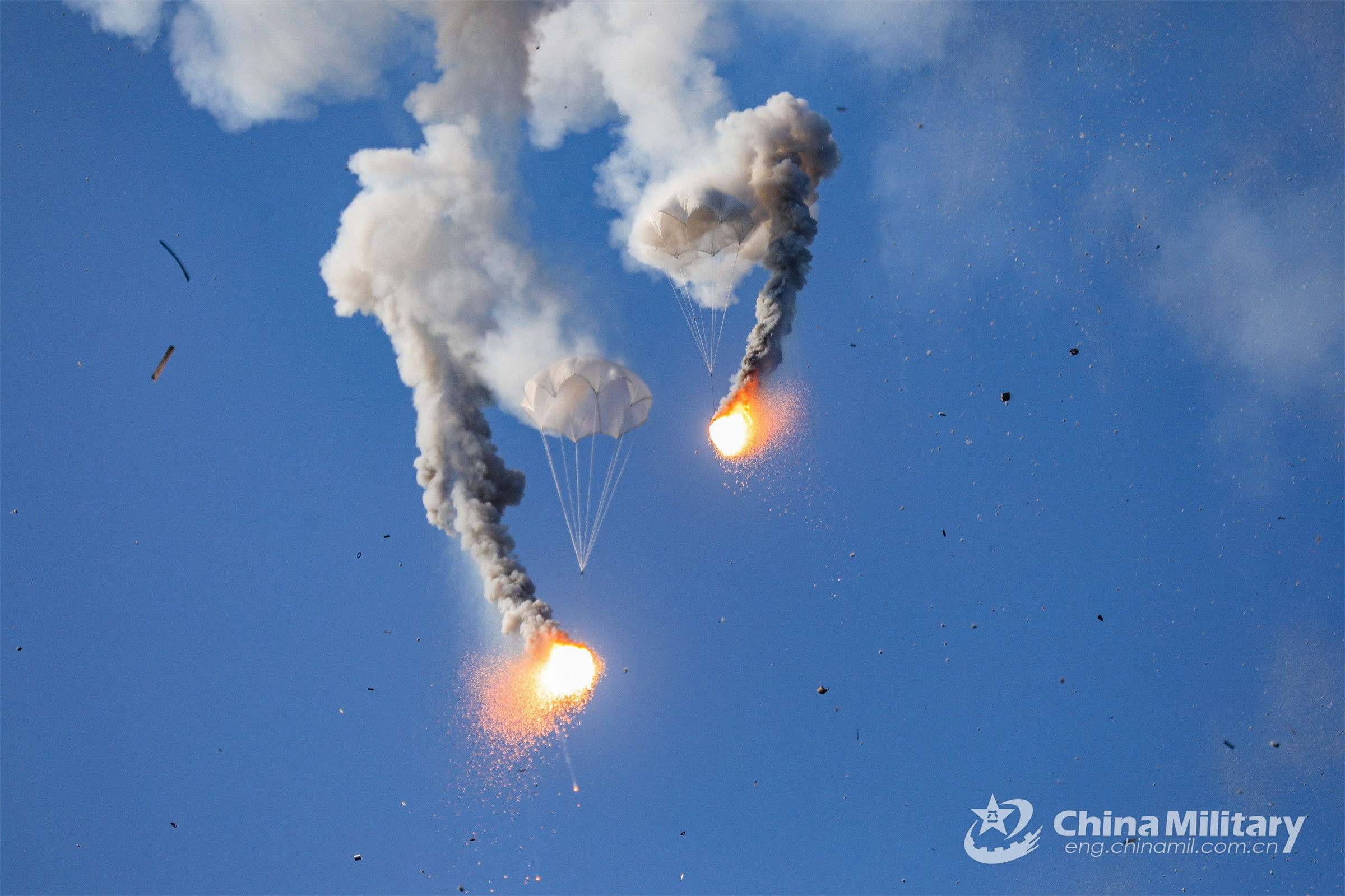Decoy flares hanging under the parachutes descend slowly in the air during an all-subject training assessment organized by a naval frigate flotilla under the PLA Southern Theater Command on September 5, 2022. (eng.chinamil.com.cn/Photo by Zhang Bin)
