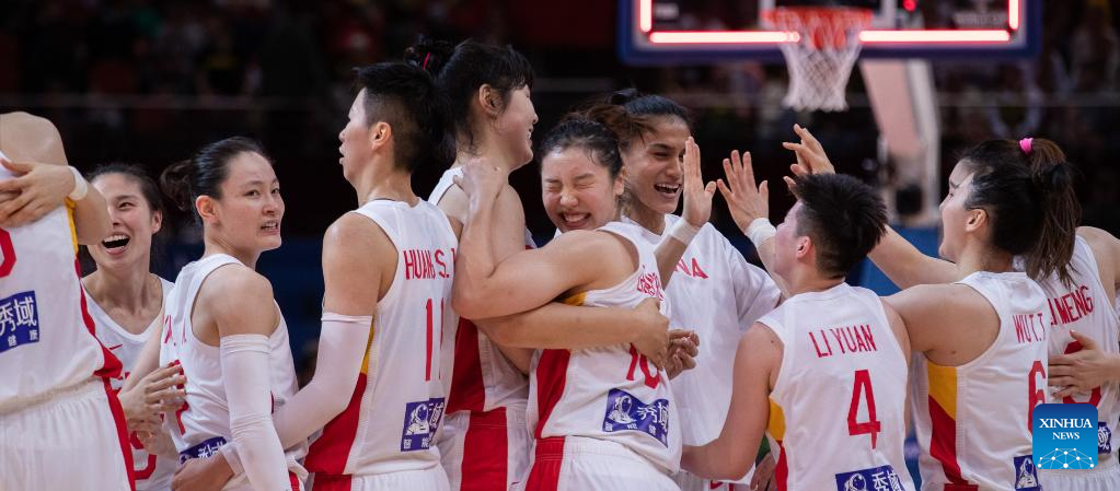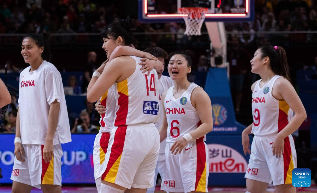 Players of China celebrate winning after the quater-final match between China and France at the FIBA Women's Basketball World Cup 2022 in Sydney, Australia, on Sept. 29, 2022. (Photo by Hu Jingchen/Xinhua)