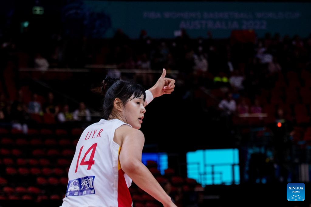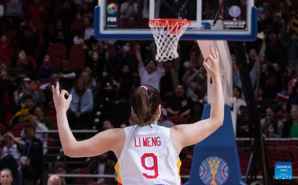 Li Meng of China gestures for 3-point during the quarter-finals match between China and France at the FIBA Women's Basketball World Cup 2022 in Sydney, Australia, on Sept. 29, 2022. (Photo by Hu Jingchen/Xinhua)