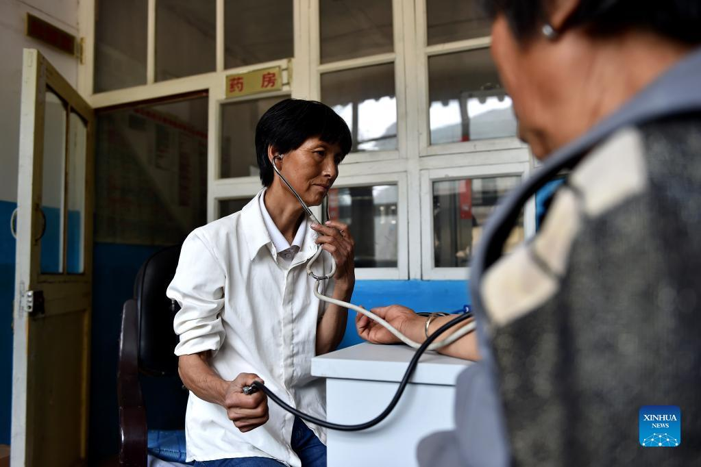Undated file photo shows Liu Guizhen measuring blood pressure for a villager at a clinic in Duanjiawan Village, Daixian County of north China's Shanxi Province. (Xinhua/Zhan Yan)