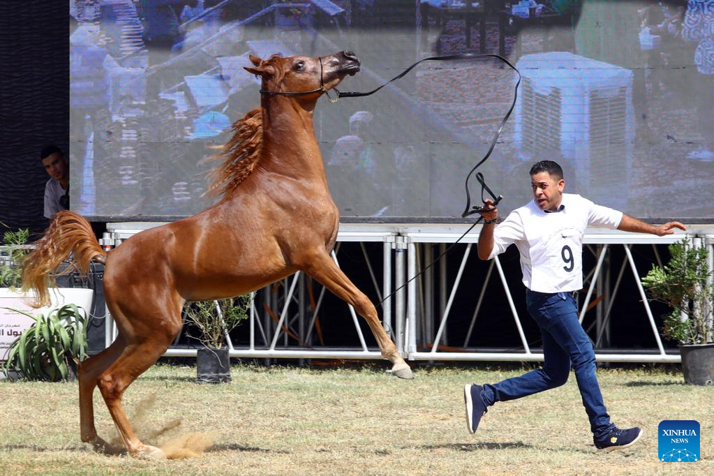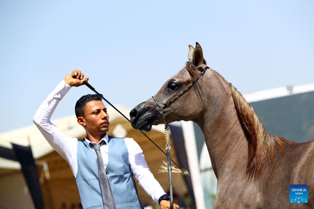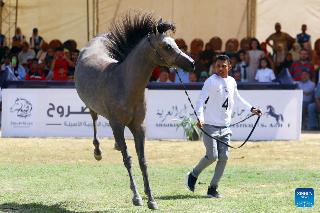 A breeder leads a horse at an Arabian horse beauty contest during the Sharqia Arabian Horses Festival in Sharqia province, Egypt, Sept. 29, 2022. The two-day horses festival started on Thursday here with the participation of 96 Arabian horses. (Xinhua/Ahmed Gomaa)