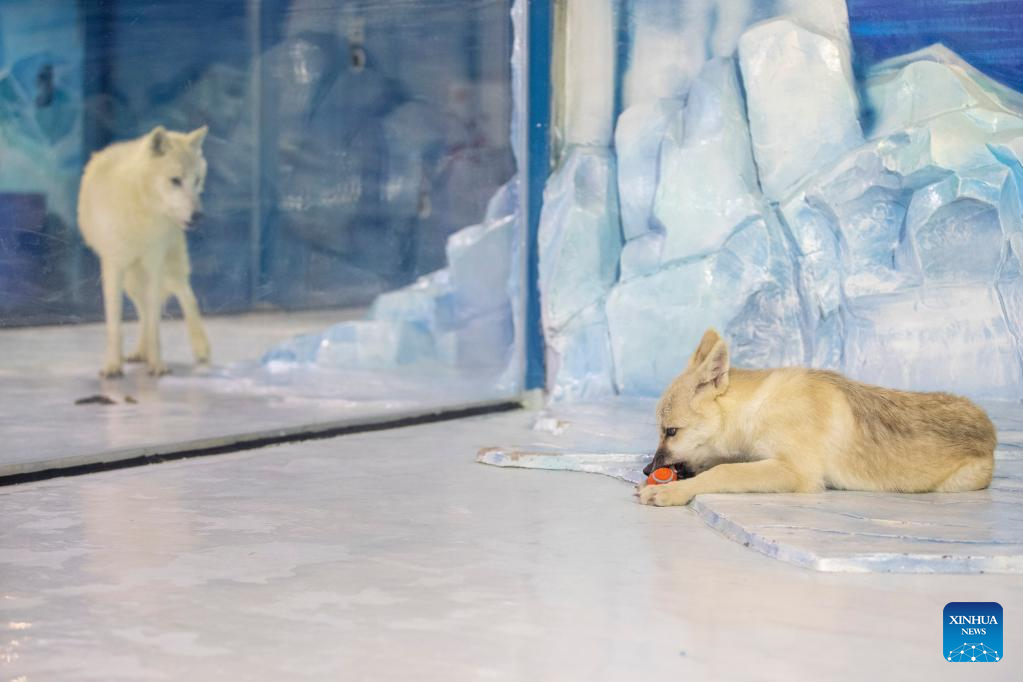 Photo taken on Sept. 28, 2022 shows a cloned arctic wolf (R) at Harbin Polarland in Harbin, capital of northeast China's Heilongjiang Province. A cloned arctic wolf met the public at Harbin Polarland in northeast China's Heilongjiang Province lately.