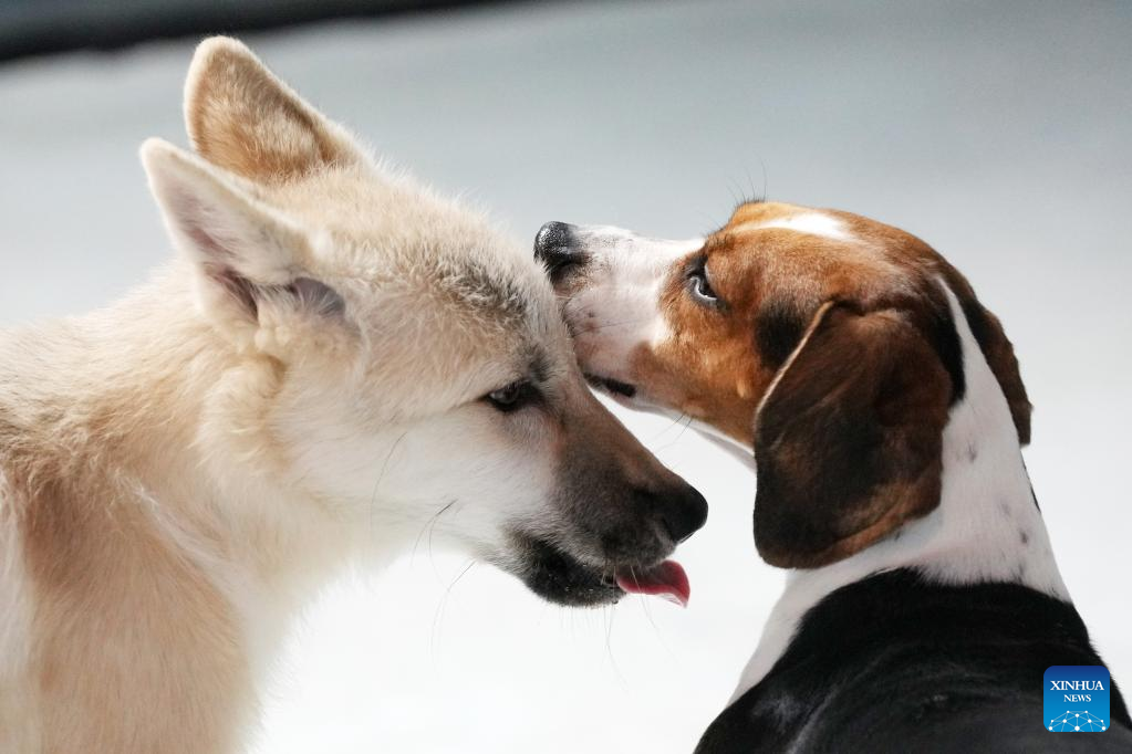 Photo taken on Sept. 26, 2022 shows a cloned arctic wolf (L) and a beagle, which is the surrogate mother of the arctic wolf, at Harbin Polarland in Harbin, capital of northeast China's Heilongjiang Province. A cloned arctic wolf met the public at Harbin Polarland in northeast China's Heilongjiang Province lately.