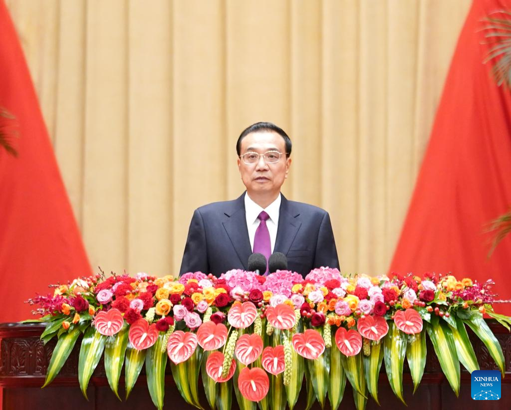 Chinese Premier Li Keqiang addresses a reception held by the State Council to celebrate the 73rd anniversary of the founding of the People's Republic of China at the Great Hall of the People in Beijing, capital of China, Sept. 30, 2022. (Xinhua/Yan Yan)