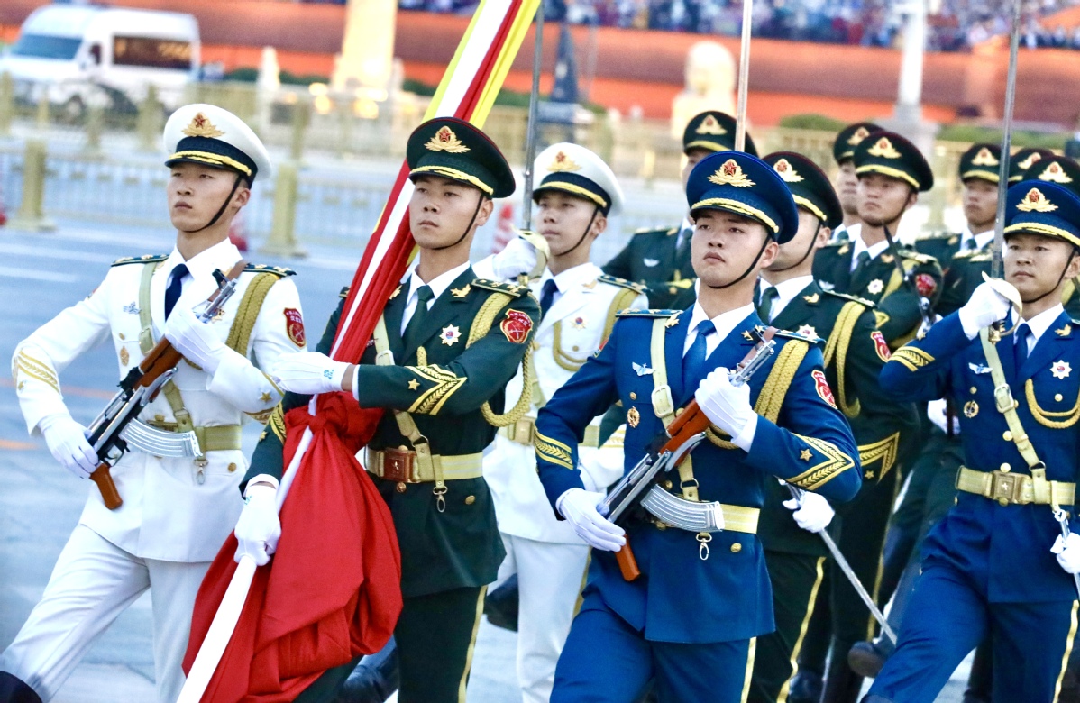 The Guard of Honor of the People's Liberation Army escorts the national flag to Tian'anmen Square in Beijing on Oct 1, 2022. [Photo by Zhu Xingxin/China Daily]