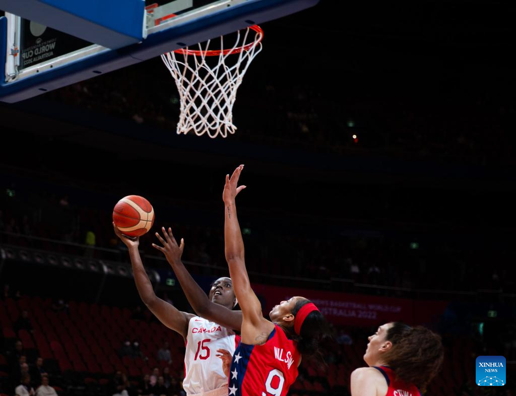 Canada's Laeticia Amihere (L) goes for a lay-up during the semifinal match between the United States and Canada at the FIBA Women's Basketball World Cup 2022 in Sydney, Australia, Sept. 30, 2022. (Photo by Hu Jingchen/Xinhua)