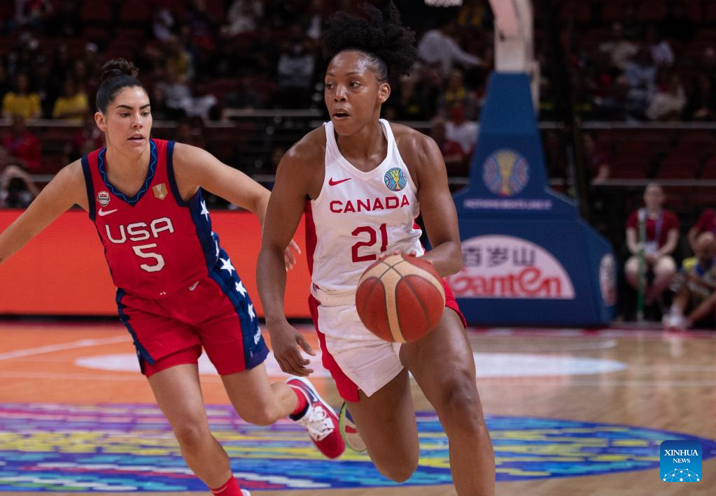 Canada's Nirra Fields (R) dribbles during the semifinal match between the United States and Canada at the FIBA Women's Basketball World Cup 2022 in Sydney, Australia, Sept. 30, 2022. (Photo by Hu Jingchen/Xinhua)