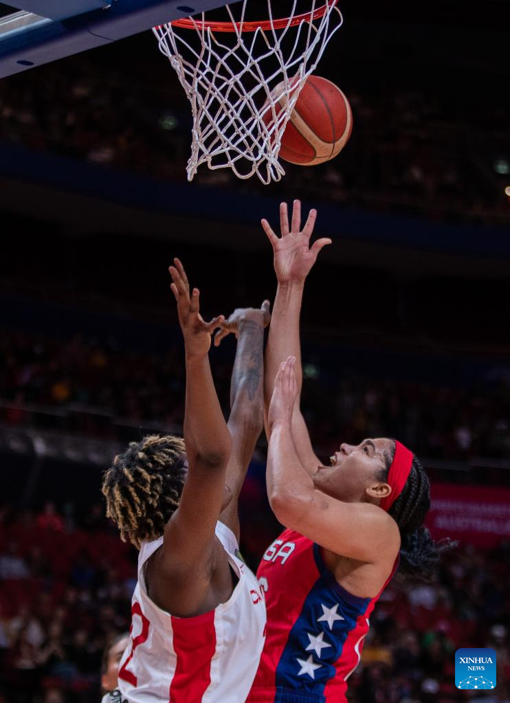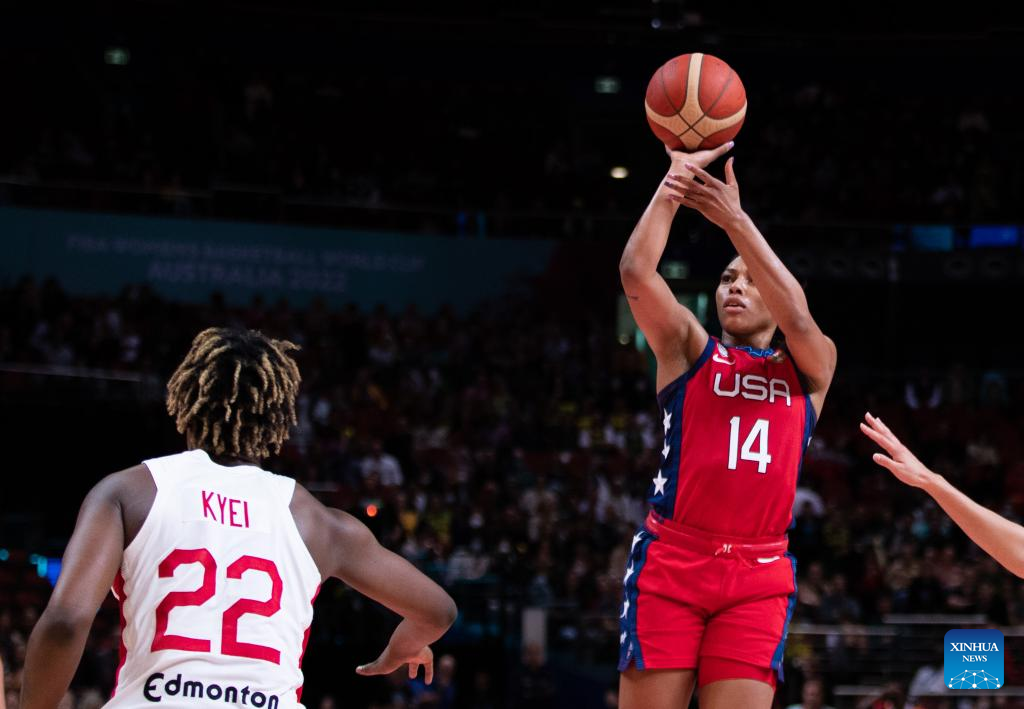 The United States' Betnijah Laney (R) shoots during the semifinal match between the United States and Canada at the FIBA Women's Basketball World Cup 2022 in Sydney, Australia, Sept. 30, 2022. (Photo by Hu Jingchen/Xinhua)