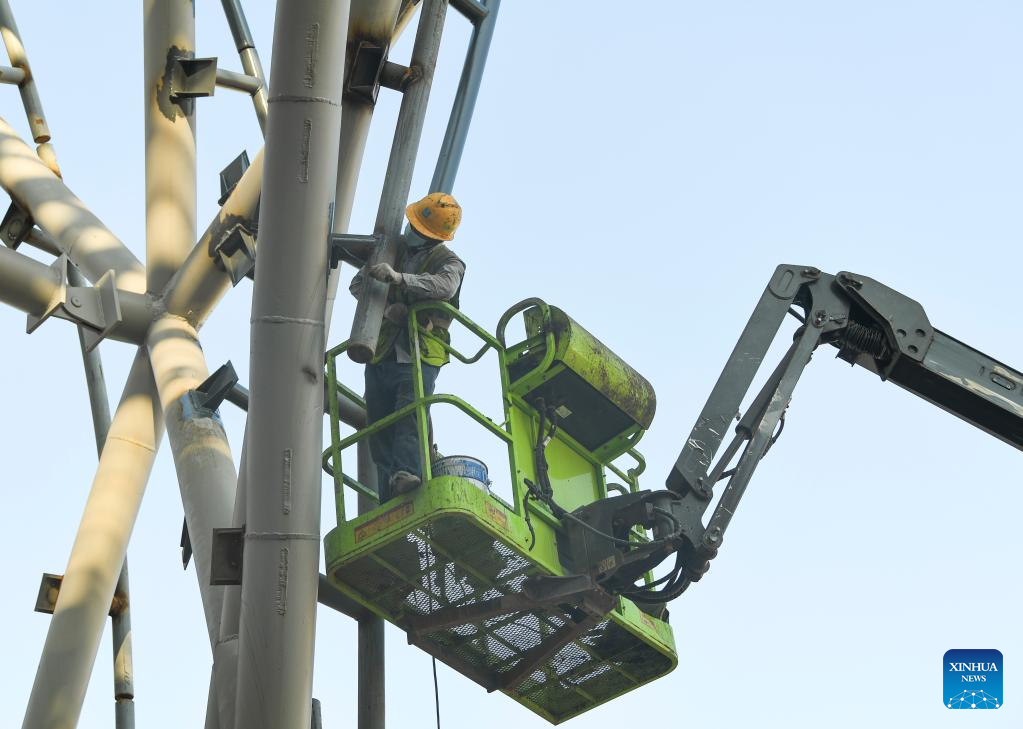 A worker works at the construction site of a youth activity center in southwest China's Chongqing Municipality, Sept. 29, 2022. The construction of a youth activity center, covering an area of about 150 mu (10 hectares), went smoothly in Chongqing. (Xinhua/Wang Quanchao)