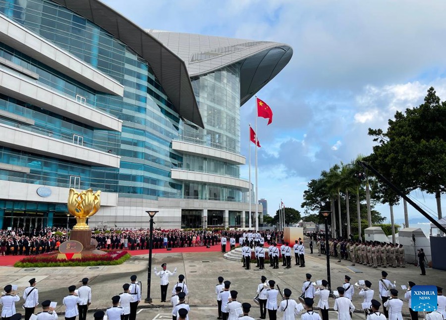 A flag-raising ceremony is held at the Golden Bauhinia Square by the Hong Kong Special Administrative Region (HKSAR) government to celebrate the 73rd anniversary of the founding of the People's Republic of China in Hong Kong, south China, Oct. 1, 2022. (Xinhua/Li Gang)