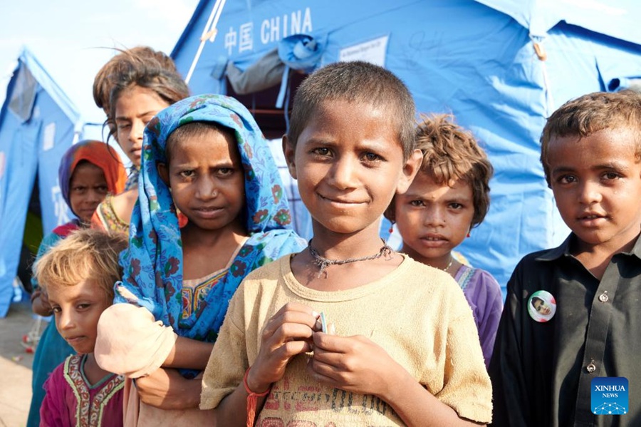 Flood-affected children are seen at a makeshift shelter built with tents donated by China in flood relief aid, in Matli town of Badin District in southern Pakistan's Sindh province, Sept. 29, 2022. (Xinhua/Tang Binhui)