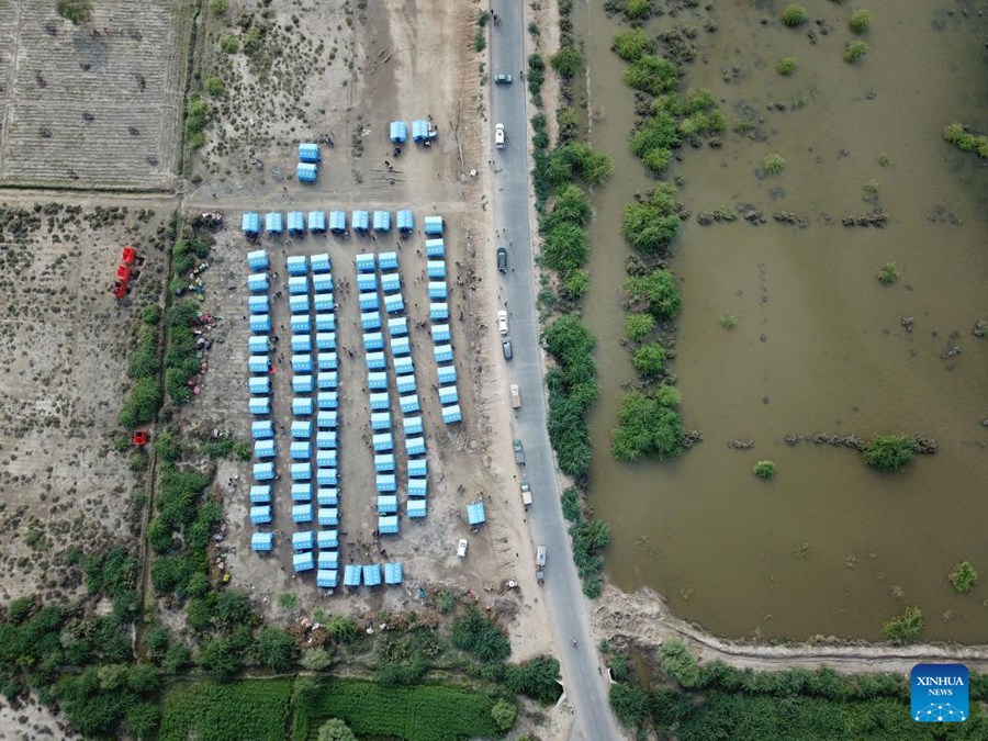 Aerial photo taken on Sept. 29, 2022 shows a makeshift shelter built with tents donated by China in flood relief aid in Matli town of Badin District in southern Pakistan's Sindh province. (Xinhua/Jiang Chao)