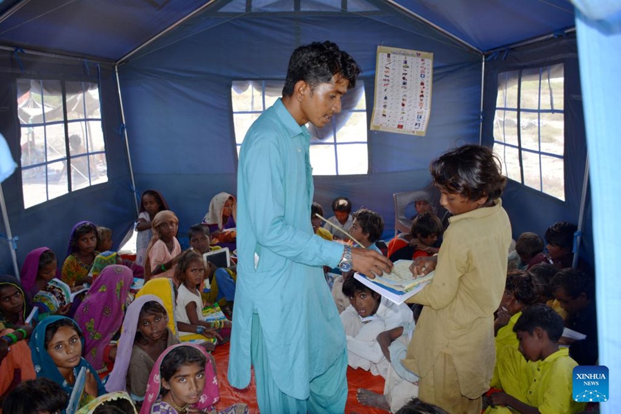 Flood-affected children attend a class in a makeshift shelter built with tents donated by China in flood relief aid in Matli town of Badin District in southern Pakistan's Sindh province on Sept. 29, 2022. (Str/Xinhua)