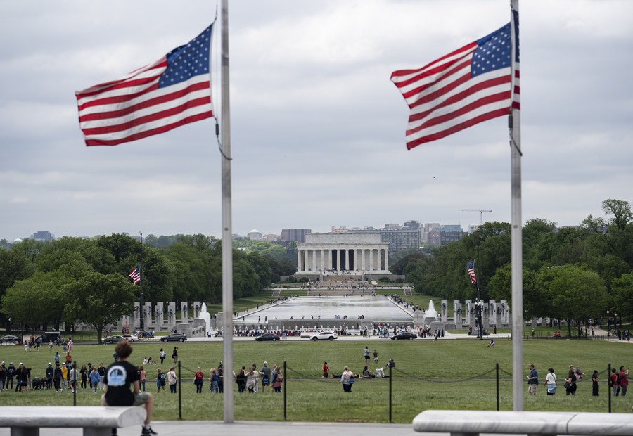 U.S. national flags fly at half-staff at the Washington Monument to mourn 1 million American lives lost to COVID-19 in Washington, D.C., the United States, May 12, 2022. (Xinhua/Liu Jie)