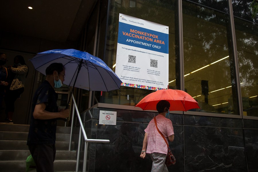 Pedestrians walk past a monkeypox vaccination site in New York, the United States, on Sept. 6, 2022. (Photo by Michael Nagle/Xinhua)