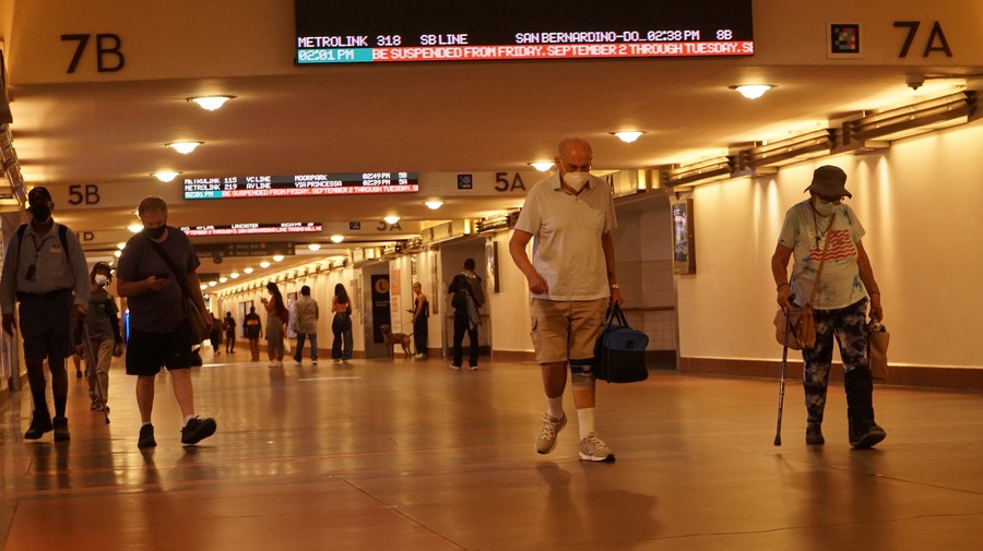 People wearing face masks are seen at L.A. union station in Los Angeles, California, the United States, on Aug. 5, 2022. (Xinhua)