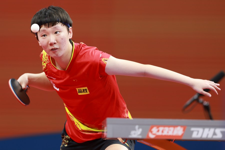 Chen Meng of China hits a return during the women's teams group 1 match against Daniely Rios of Puerto Rico at the 2022 ITTF World Team Table Tennis Championships Finals in Chengdu, southwest China's Sichuan Province, Oct. 2, 2022. (Xinhua/Liu Xu)