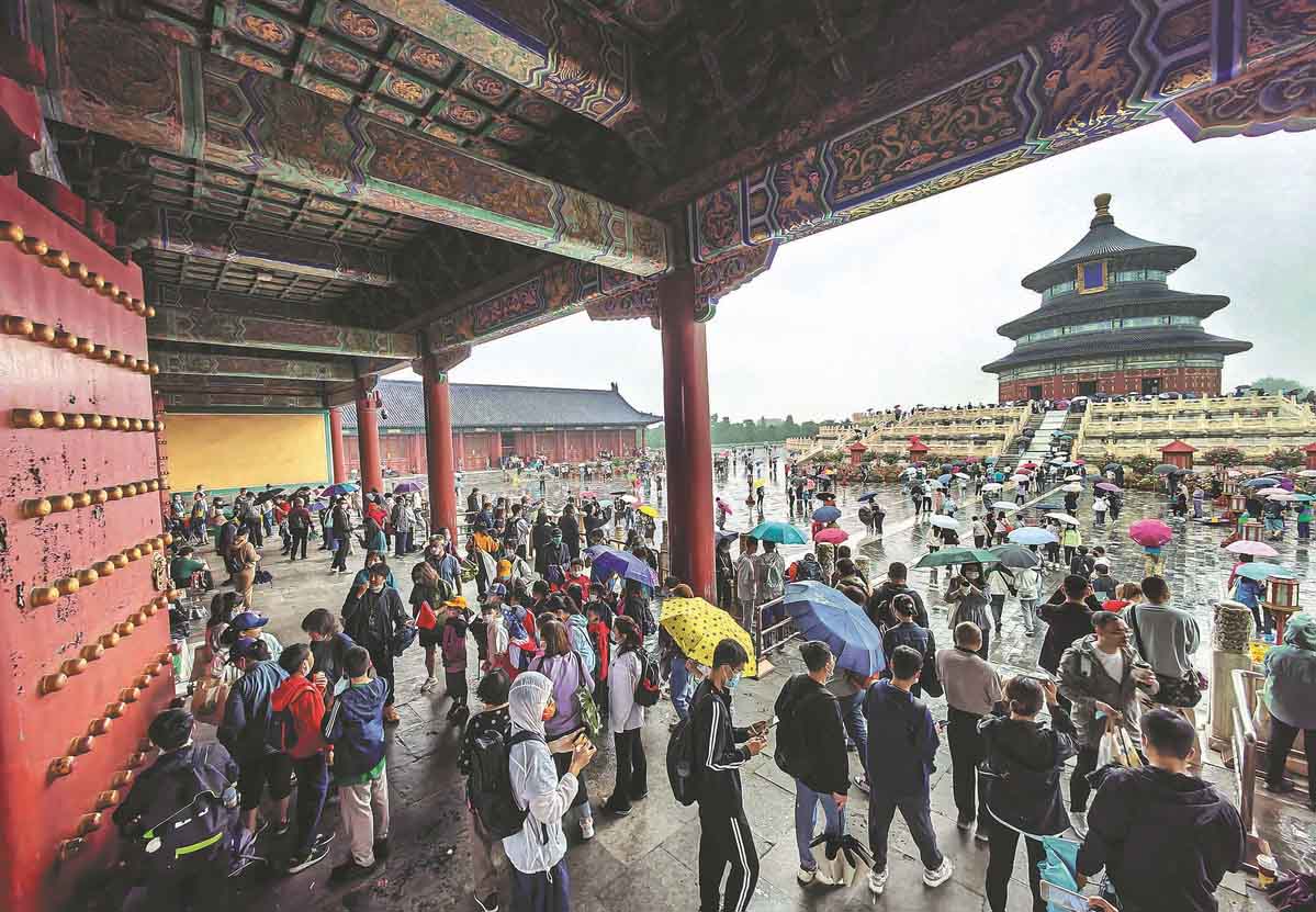 Tourists visit the Temple of Heaven in Beijing on Sunday. Local tourism has been booming in many cities nationwide, including Beijing, Chongqing and Shanghai, during this year's National Day holiday. PANG ZHENGZHENG/FOR CHINA DAILY