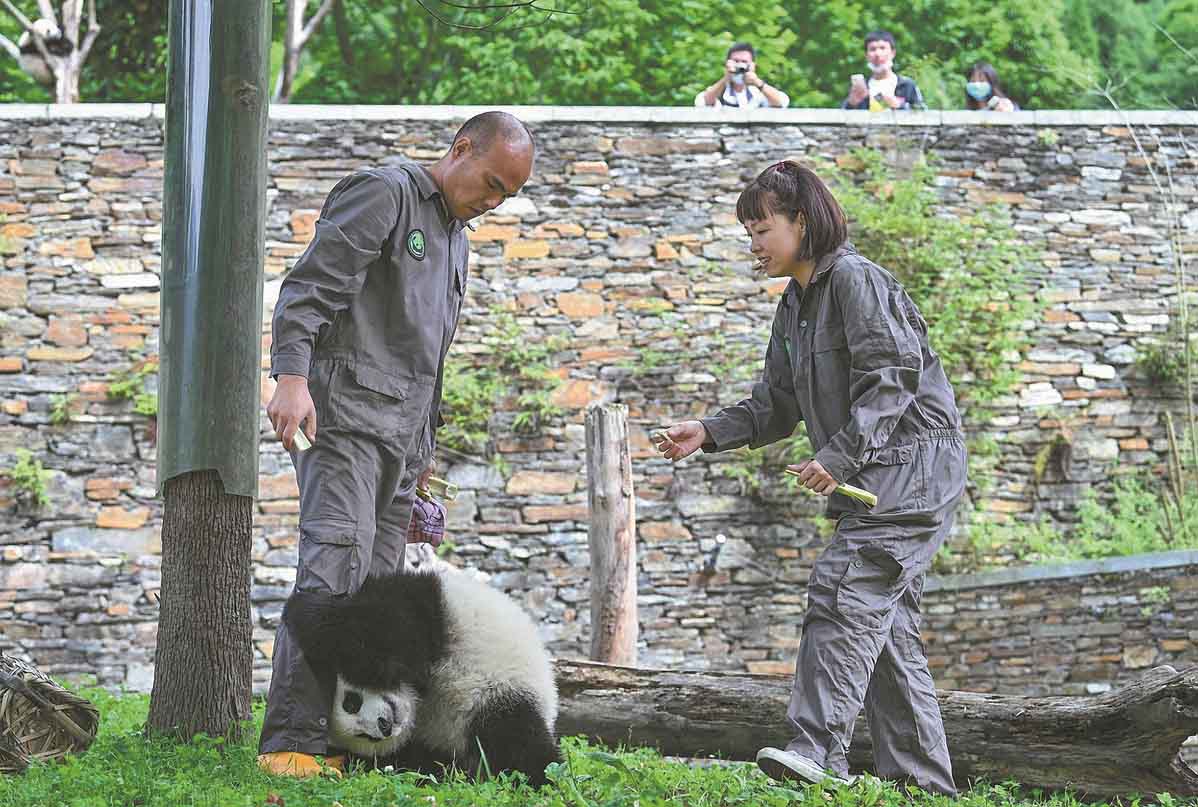 Janet Long Shun Kwan from Hong Kong and her husband, Dong Chao, a Sichuan local resident, take care of giant pandas together in the Shenshuping Base of the China Giant Panda Conservation and Research Center in Wenchuan, Sichuan province. HE HAIYANG/FOR CHINA DAILY