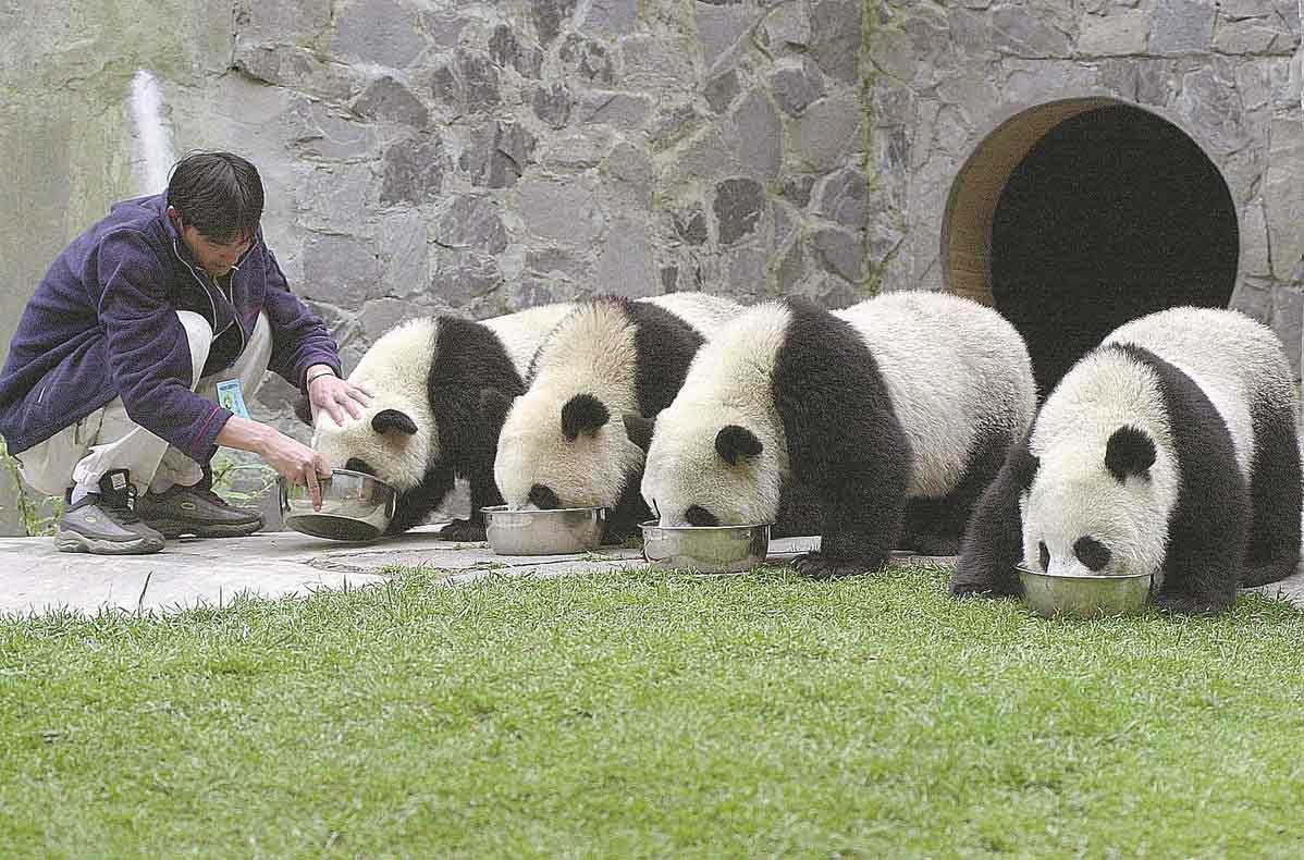 Giant pandas drink milk at the Hetaoping Base in Wenchuan, Sichuan province in January, 2007. HE HAIYANG/FOR CHINA DAILY