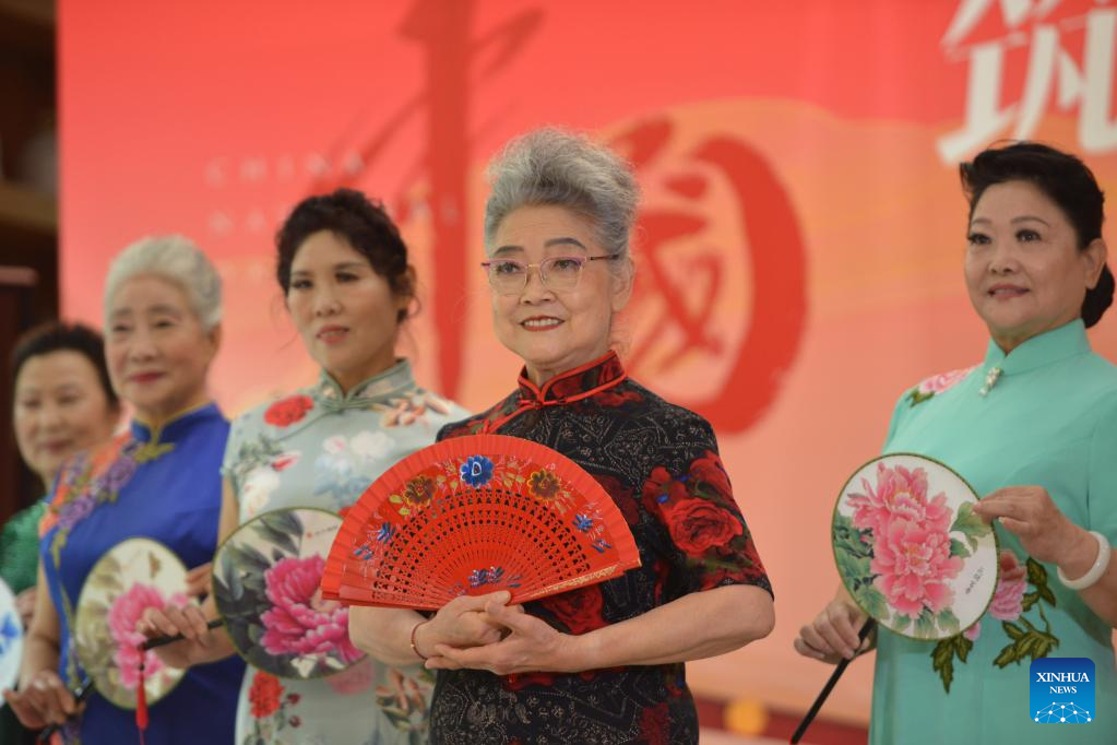 Han Xiangqiao (2nd R), 75, performs as a model during an activity in Xinhua District of Shijiazhuang, north China's Hebei Province, Oct. 3, 2022. Chinese elderly enjoy retired life as they indulge in their hobbies. (Photo by Yan Zhiguo/Xinhua)