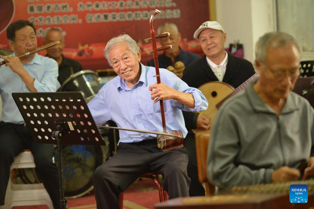 Liu Mingfei (C), 80, plays Erhu, a Chinese musical instrument, in a band in Luancheng District of Shijiazhuang, north China's Hebei Province, Oct. 2, 2022. Chinese elderly enjoy retired life as they indulge in their hobbies. (Photo by Yan Zhiguo/Xinhua)